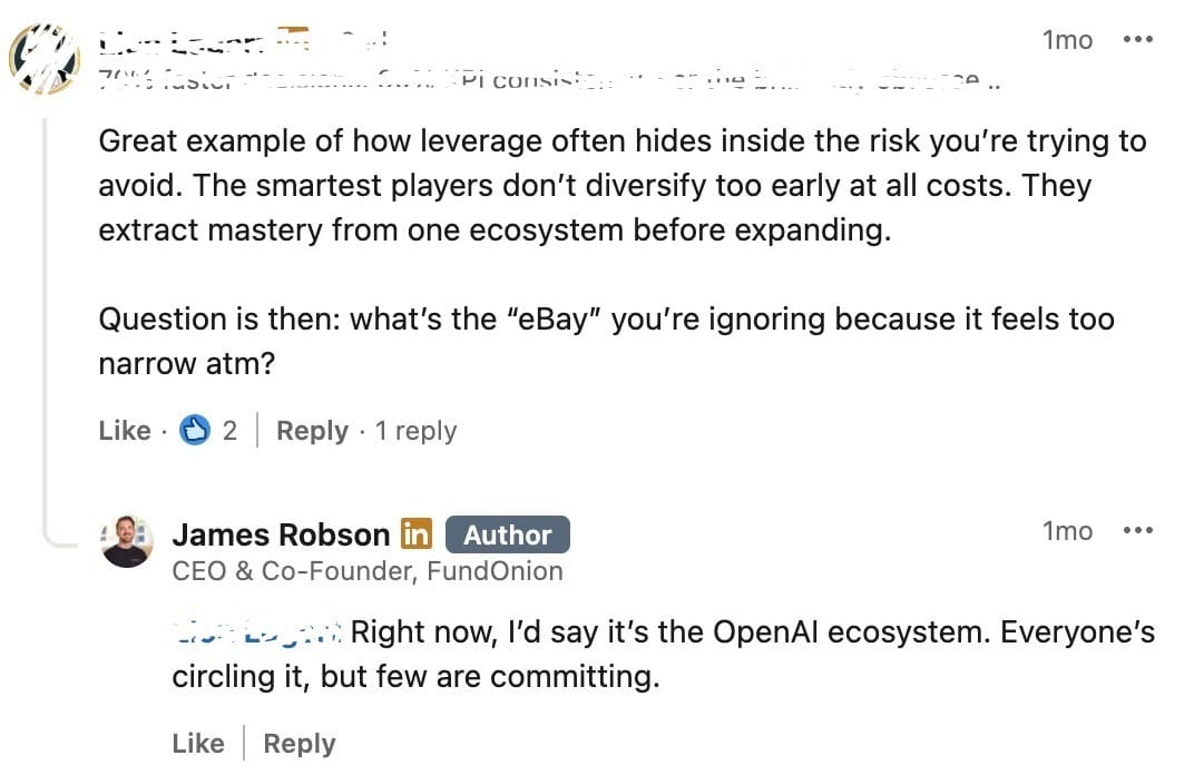 PayPal proves that concentration risk doesn’t mean future disaster. Having 67% of their business tied to eBay looked terrifying on paper, but it gave them exactly what early-stage companies usually lack: volume, behaviour data and constant feedback. That “risk” helped them improve the product far faster than if they’d tried to spread themselves across five different customer types.