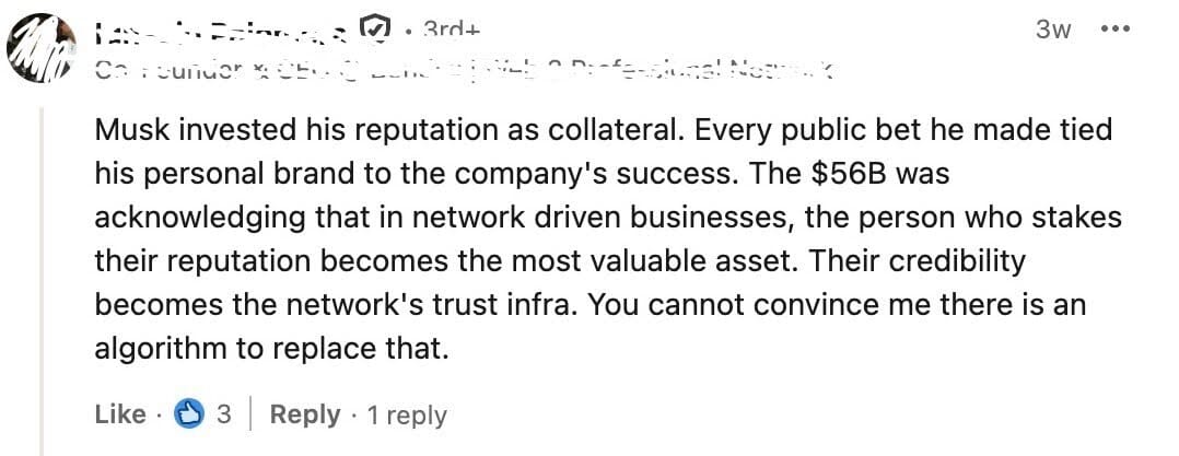I recently posted on LinkedIn about Musk. Someone replied that credibility is basically the internet’s new currency, and they’re right. It’s what Musk trades in, and he’s made billions doing it.
